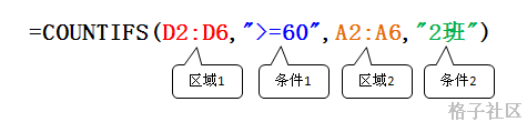 =COUNTIFS(D2:D6,">=60",A2:A6,"2班") 結(jié)果將求出2班里面數(shù)學(xué)成績(jī)及格的學(xué)生總數(shù),請(qǐng)看下面動(dòng)畫(huà)圖片