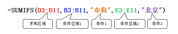 SumIfs(求和區(qū)域,條件區(qū)域1,條件1,條件區(qū)域2,條件2,...)