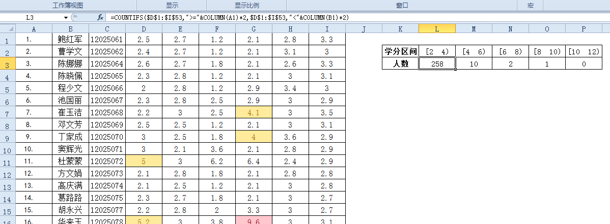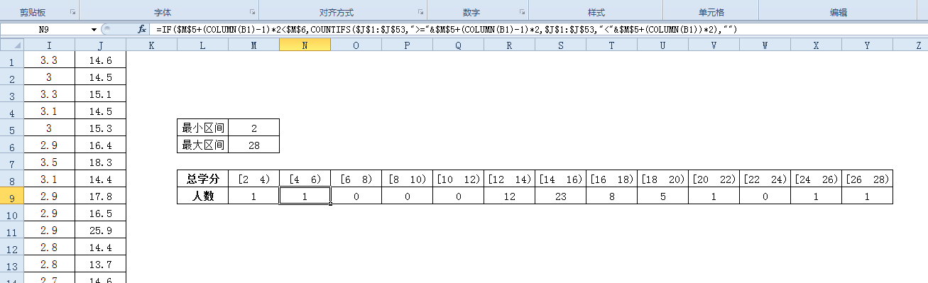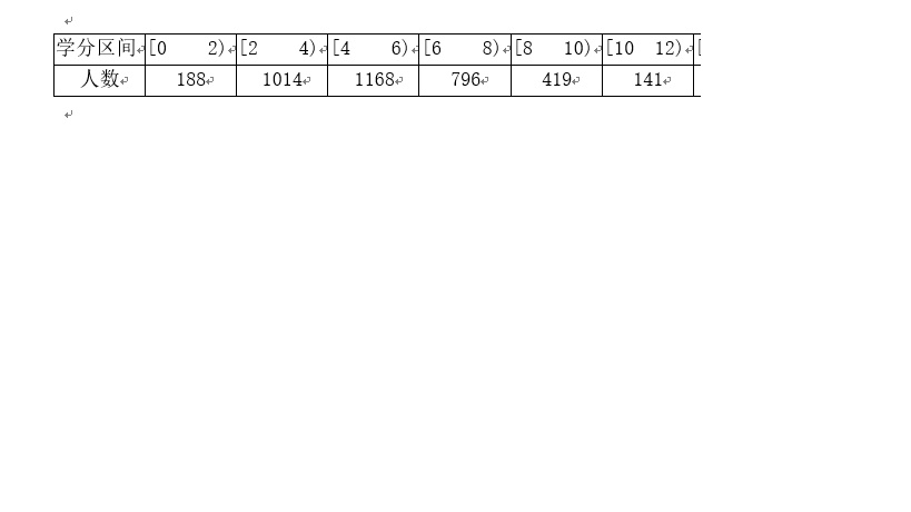 如圖,如何把工作表中的總學(xué)分,分成組距為2的的若干區(qū)間(例如:[0,2)[2,4)。。。。),分別統(tǒng)計出總學(xué)分落在對應(yīng)區(qū)間里的人數(shù)