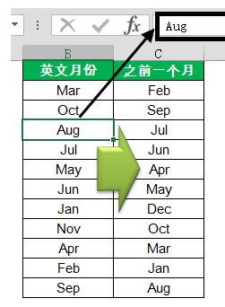 大致說說題目的意思:B列是英文簡寫的月份,需要計算之前一個月的月份,并且結(jié)果同樣為英文月份,效果如C列所示。