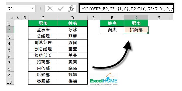 上圖中,C:D是數(shù)據(jù)源,需要根據(jù)F2單元格指定的姓名查詢對應(yīng)的職務(wù)。G2單元格的公式為: