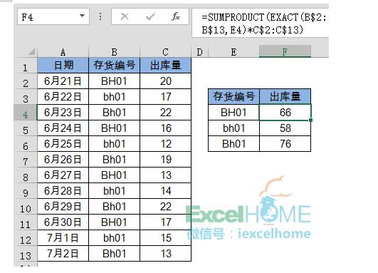 =SUMPRODUCT(EXACT(B$2:B$13,E4)*C$2:C$13)