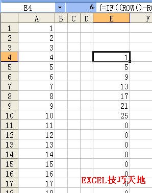 如果要在Excel獲取某列中每隔N行的單元格值,例如數(shù)據(jù)在A1:A100區(qū)域中,現(xiàn)在要從A1單元格開始,每個4行獲取各單元格數(shù)據(jù),即獲取A1、A5、A9、……單元格中的數(shù)據(jù),并將其連續(xù)地放到E列中從E4單元格開始的區(qū)域中,可以用下面的數(shù)組公式: