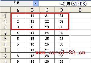 計算A1:D3區(qū)域中所有單元格數(shù)值的和。