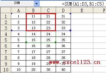 計算A1:D3和B1:C5兩個區(qū)域的交叉區(qū)域,即B3:C3區(qū)域所有單元格數(shù)值的和。