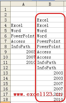 問(wèn)題:Excel工作表的A列中包含一些數(shù)據(jù),現(xiàn)在要在另一列中將A列的每個(gè)數(shù)據(jù)重復(fù)N次,如圖是在B列中重復(fù)2次的情況,在不使用VBA代碼的情況下,如何快速操作?