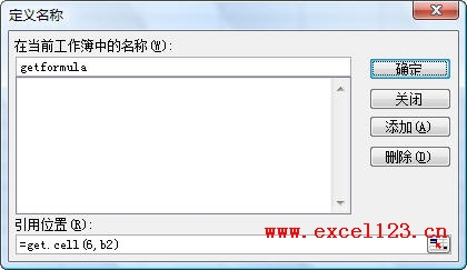 在“在當(dāng)前工作簿中的名稱”下輸入一個名稱,例如“getformula”,在“引用位置”下輸入公式:
