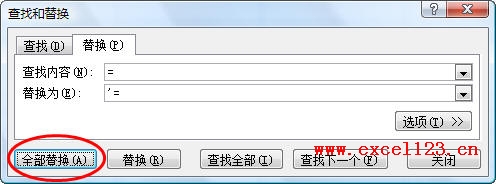 2.選擇包含公式的單元格進(jìn)行復(fù)制,然后粘貼到所需區(qū)域。接著按Ctrl+H打開“查找和替換”對話框,將“=”替換為“'=”,“'”為英文單引號,單擊“全部替換”按鈕。