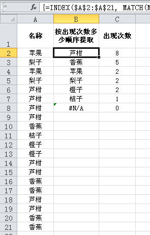 在Excel中某列包含許多重復(fù)的數(shù)據(jù),要從該列中按出現(xiàn)次數(shù)多少的順序提取數(shù)據(jù),可以用下面的數(shù)組公式。假如數(shù)據(jù)在A2:A21區(qū)域中,如圖。