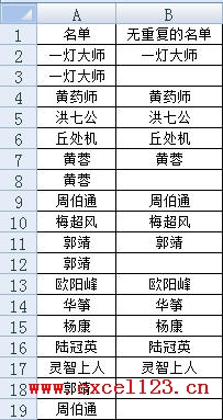 假如在A2:A19中有一列名單,現(xiàn)在要將無重復的名單放在B列中。