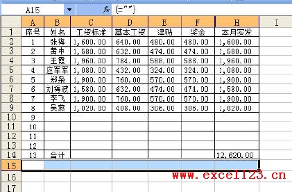 再選擇A15:H15,然后輸入數(shù)組公式。如圖: