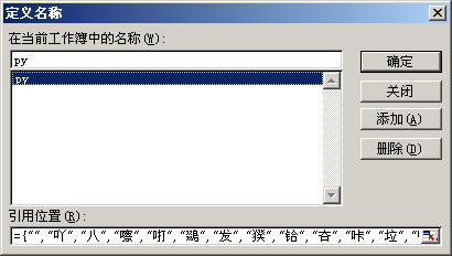 單擊菜單“插入→名稱→定義”,在彈出的對話框中“在當(dāng)前工作簿中的名稱”下的文本框中輸入一個(gè)名稱,如“py”,在“引用位置”下輸入下列代碼后確定:
