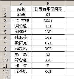 用公式將漢字轉(zhuǎn)換為拼音的第一個(gè)字母