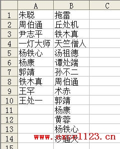 如果有兩列相似的數(shù)據(jù),要在其中一列中找出在另一列中重復(fù)的內(nèi)容,可以用條件格式,還可以使用公式來查找。這里介紹用公式的方法,假如在A1:A10和B1:B14有兩列名單,現(xiàn)在要找出B列中與A列相同的數(shù)據(jù),如圖。