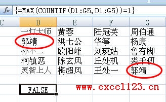 如果需要用公式來判斷某個區(qū)域中是否包含重復(fù)值,可以用下面的數(shù)組公式。假如要判斷的區(qū)域為D1:G5,在某個單元格中輸入數(shù)組公式: