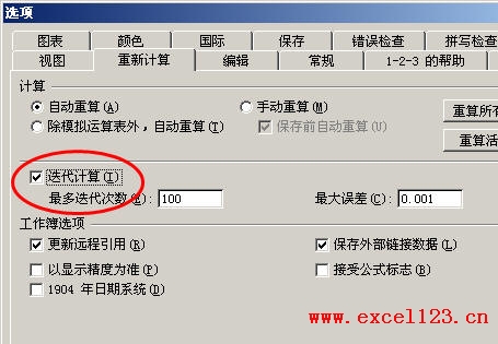 單擊菜單“工具→選項(xiàng)→重新計(jì)算”,勾選“迭代計(jì)算”,然后單擊“確定”。