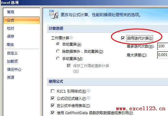單擊“Office按鈕→Excel 選項(xiàng)→公式”,在“計(jì)算選項(xiàng)”區(qū)域中,勾選“啟用迭代計(jì)算”選項(xiàng)。