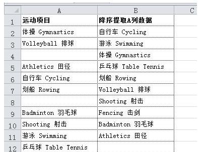 假如A2:A14中包含一些文本和空單元格,要將其中的文本按字母順序降序提取到B列,如圖所示。
