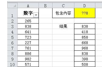由于用到了SEARCH函數(shù),因而可以支持通配符。如要返回A列中結(jié)尾為“8”的數(shù)字,只需在D1中輸入“??8”。