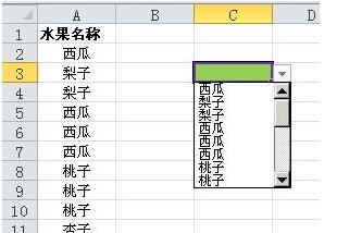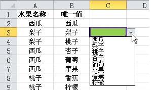 有時(shí)需要以一列數(shù)據(jù)為來源制作數(shù)據(jù)有效性下拉列表,但當(dāng)該列數(shù)據(jù)包含重復(fù)值時(shí),下拉列表中也會(huì)包含這些重復(fù)的項(xiàng)目,如下圖中A列包含一些水果名稱,在C3單元格中直接用數(shù)據(jù)有效性創(chuàng)建的下拉列表就包含了多個(gè)重復(fù)項(xiàng),顯得不夠簡(jiǎn)潔。