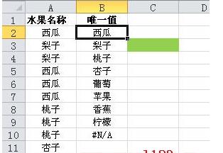 公式輸入完畢后按Ctrl+Shift+Enter結(jié)束,然后拖動(dòng)填充柄向下填充公式,直到出現(xiàn)“#N/A“為止,這樣就將A列中的唯一值提取到B列。