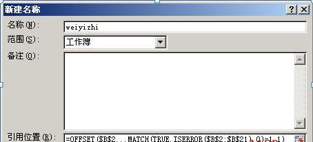 Excel 2003:?jiǎn)螕舨藛巍安迦搿Q→定義”,彈出“定義名稱”對(duì)話框,在“在當(dāng)前工作簿中的名稱”下的文本框中輸入一個(gè)名稱,如“weiyizhi”,在“引用位置”下輸入上述公式,單擊“確定”。
