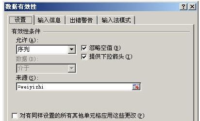 在彈出的“數(shù)據(jù)有效性”對(duì)話框中選擇“設(shè)置”選項(xiàng)卡,在“允許”下選“序列”,在“來源”下的文本框中輸入公式: