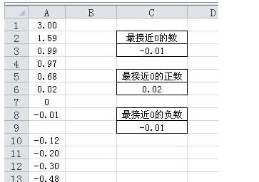 在C3單元格中輸入數(shù)組公式:=INDEX(A1:A15,MATCH(MIN(IF(A1:A15,ABS(A1:A15))),ABS(A1:A15),))