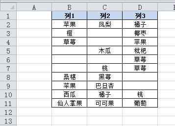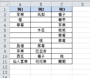 假如數(shù)據(jù)在A1:C11區(qū)域,其中還包含一些空單元格,如圖所示。