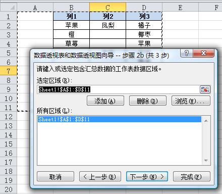 3.再次單擊“下一步”,在彈出的對話框中選擇并添加數(shù)據(jù)區(qū)域。在選擇區(qū)域時注意要包含原數(shù)據(jù)區(qū)域的左側(cè)列及標題列。本例為包含上述空白列的A1:D11。