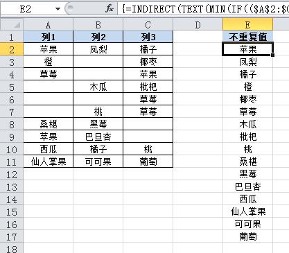 =INDIRECT(TEXT(MIN(IF(($A$2:$C$11<>"")*(COUNTIF($E$1:E1,$A$2:$C$11)=0),ROW($2:$11)*100+COLUMN($A:$C),7^8)),"R0C00"),)&""