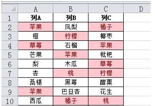 有時需要要提取多行多列區(qū)域中的重復數(shù)據(jù)到某列,如下圖所示,A2:C11包含一些重復的水果名稱(已用深紅色進行了標記),要將重復的名稱提取到E列。