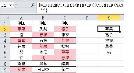 在E2中輸入數(shù)組公式:=INDIRECT(TEXT(MIN(IF((COUNTIF($A$2:$C$11,$A$2:$C$11)>1)*(COUNTIF($E$1:E1,$A$2:$C$11)=0),ROW($2:$11)*100+COLUMN($A:$C),7^8)),"R0C00"),)&""