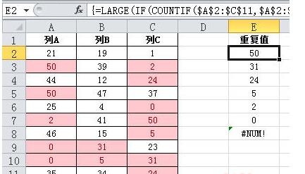 =LARGE(IF(COUNTIF($A$2:$C$11,$A$2:$C$11)>1,$A$2:$C$11),SUM(COUNTIF($A$2:$C$11,$E$1:E1))+1)