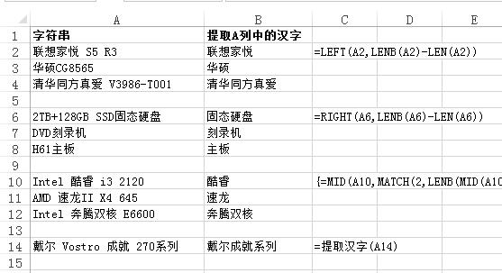 如果漢字位于字符串的中間,可使用下面的數(shù)組公式。例如圖中A10:A12區(qū)域中的字符串,在B10中輸入數(shù)組公式:
