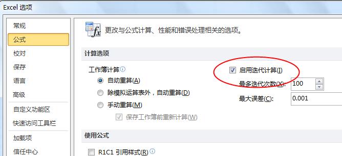 Excel 2007/2010/2013:?jiǎn)螕簟癘ffice按鈕(文件)→選項(xiàng)→公式”,在“計(jì)算選項(xiàng)”區(qū)域勾選“啟用迭代計(jì)算”。