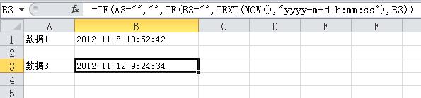 2.在B1單元格中輸入公式:=IF(A1="","",IF(B1="",TEXT(NOW(),"yyyy-m-d h:mm:ss"),B1))
