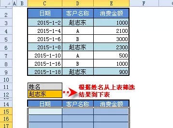 例:如下圖所示。要求根據(jù)的姓名,從上面表中篩選所有符合姓名是“趙志東”的記錄。