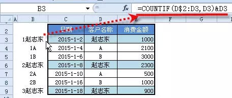 解析:在設(shè)置公式時,輔助列總可以讓復(fù)雜的問題變得簡單起來,此題也不例外。在B列設(shè)置公式:=COUNTIF(D$2:D3,D3)&D3