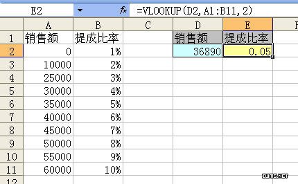 公式為:=VLOOKUP(D2,A1:B11,2)