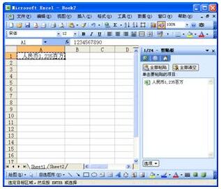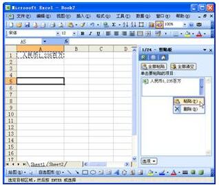 圖71-1 連續(xù)兩次按<Ctrl+C>會讓Office剪貼板出現(xiàn)選定目標(biāo)單元格或單元格區(qū)域,單擊Office剪貼板中剛才復(fù)制項目旁邊的下拉箭頭,在彈出的菜單中選擇“粘貼”命令,如圖71-2所示。這樣,原始區(qū)域的數(shù)據(jù)會被粘貼到目標(biāo)區(qū)域。