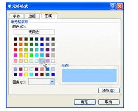單擊“格式”按鈕,在“單元格格式”對話框的“圖案”選項卡中選擇單元格底紋顏色為淡藍,單擊“確定”按鈕,如圖88-3所示。