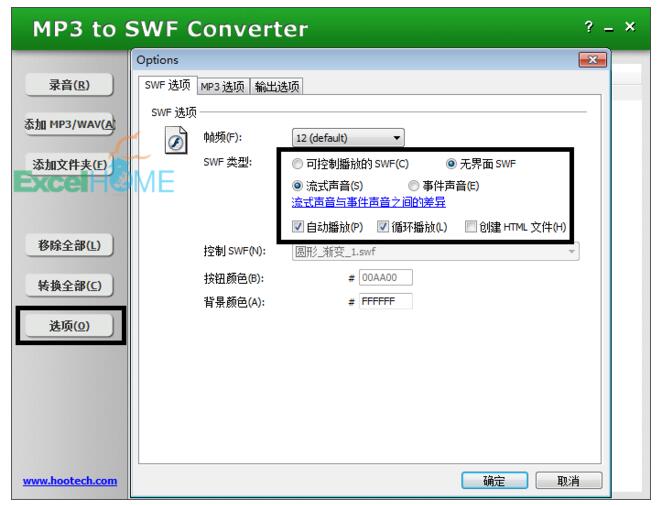 使用音頻轉(zhuǎn)Flash軟件,把MP3文件轉(zhuǎn)換為SWF格式。網(wǎng)上有很多,推薦使用: