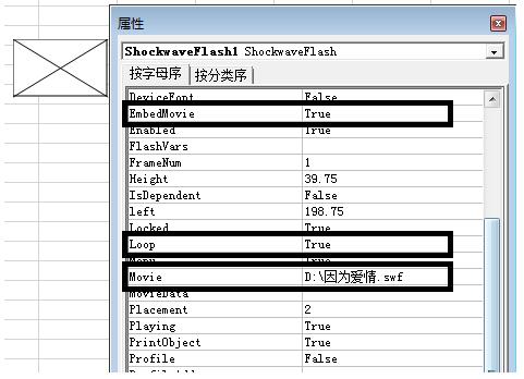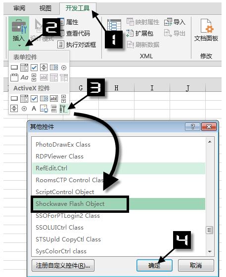 點擊【開發(fā)工具】選項卡,【ActiveX控件】、【其他控件】、【Shockwave Flash Object】控件,在表格中畫出一個控件。