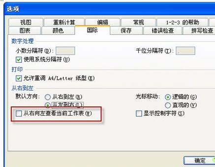 A:工具→選項(xiàng)→“國(guó)際”選項(xiàng)卡→去掉“從右向左查看當(dāng)前工作表”的勾選。