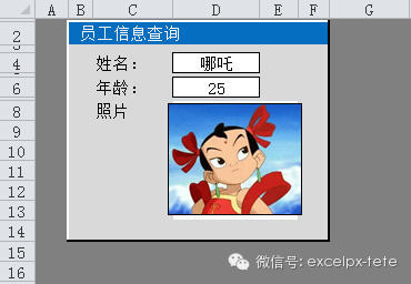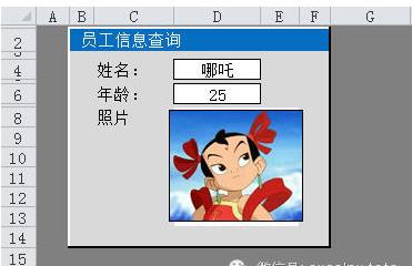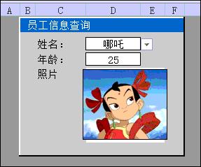 例:如下圖所示的員工信息表中,C列是員工的照片,要求在查找界面中,根據(jù)姓名,顯示該員工的照片。