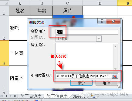第1步:在員工信息表中,公式 - 定義名稱(excel2003版,插入菜單 - 名稱 - 定義),在定義名稱窗口中,輸入名稱pic(名稱是自定義的) ,在引用框中輸入以下公式:
