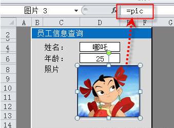 第2步:在員工查詢主界面中插入任一張圖片,調(diào)整大小后選取它,在編輯欄中輸入=pic,回車完成輸入。