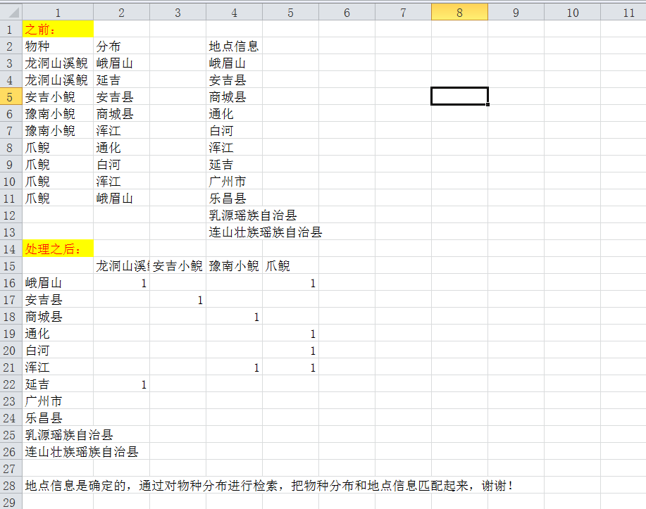 之前整理的信息比較雜亂,無法導(dǎo)入GIS中應(yīng)用,想對(duì)對(duì)信息進(jìn)行分類處理,具體描述如圖,謝謝各位大神!