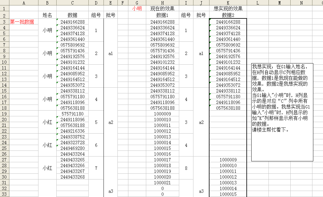 當(dāng)G1輸入"小明"時(shí),H列顯示的是對(duì)應(yīng)“C”列中所有小明的數(shù)據(jù)。我想實(shí)現(xiàn)當(dāng)G1輸入"小明"時(shí),H列顯示的如"K"列那樣顯示所有小明的數(shù)據(jù)。